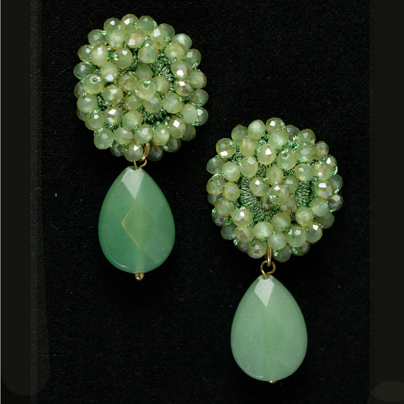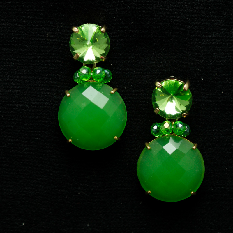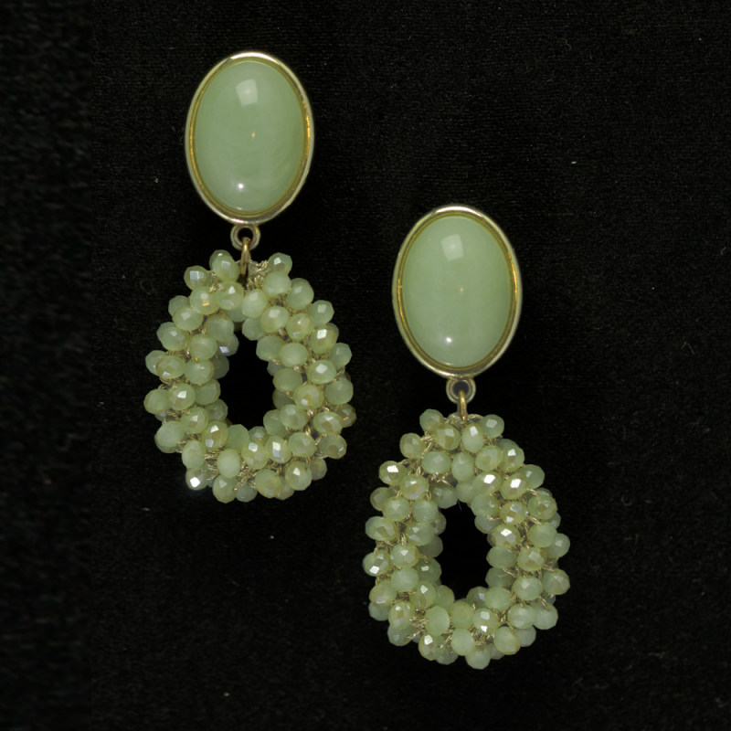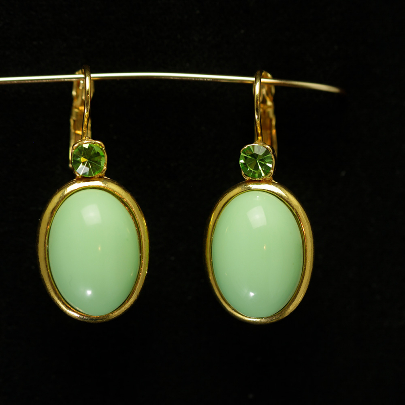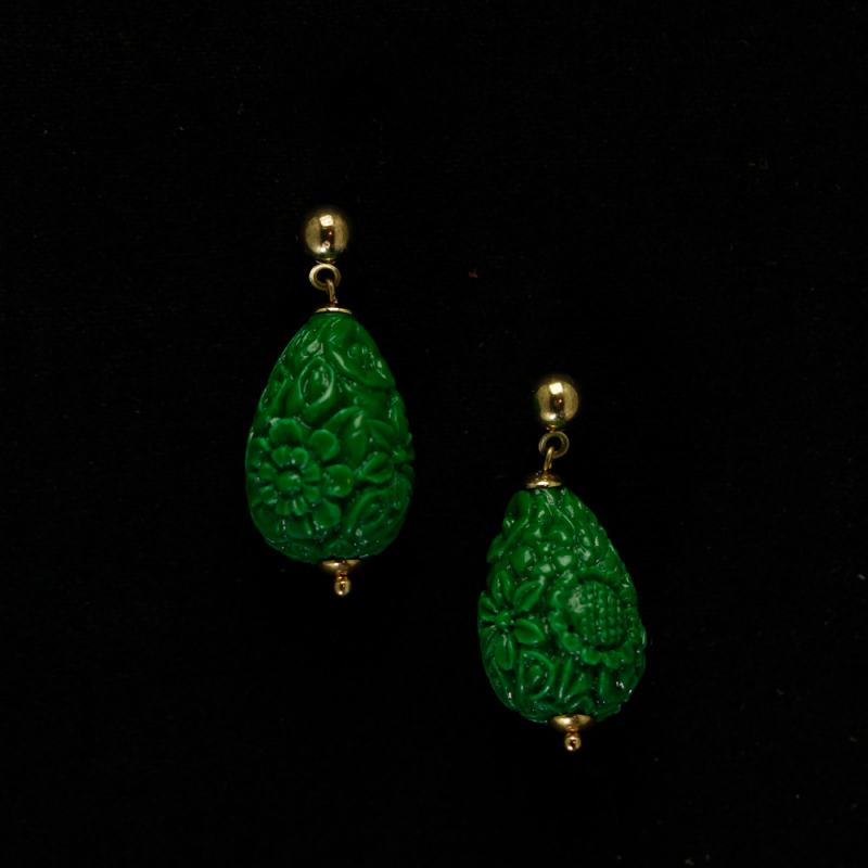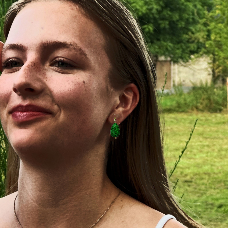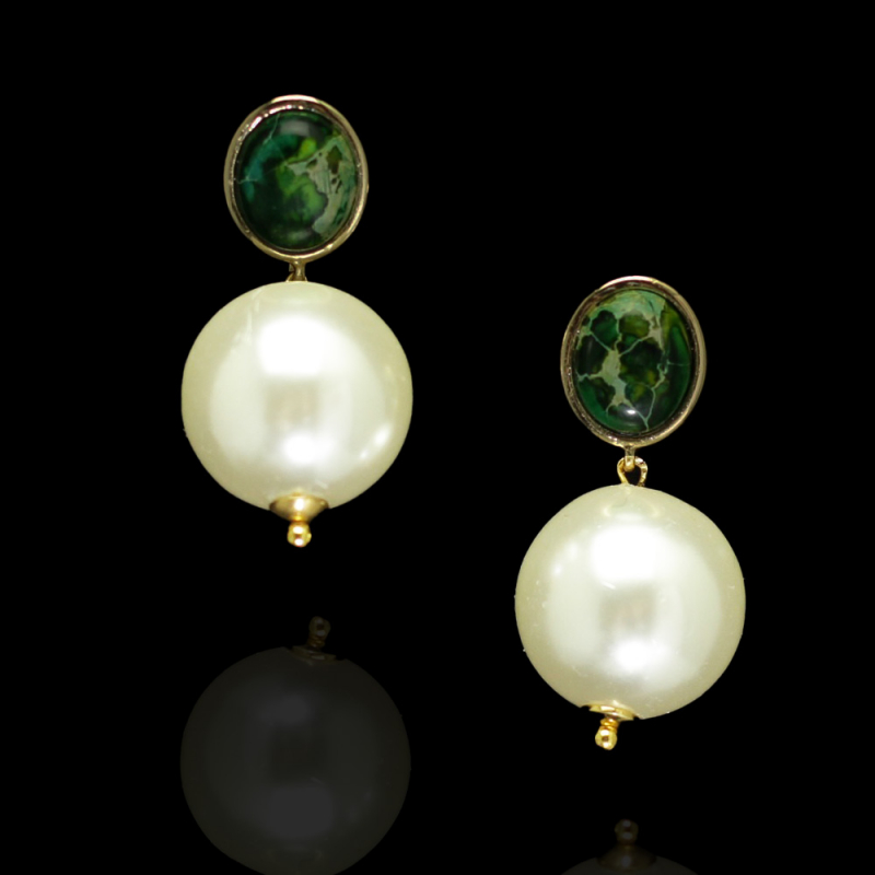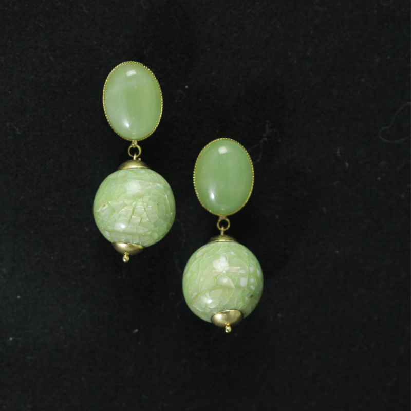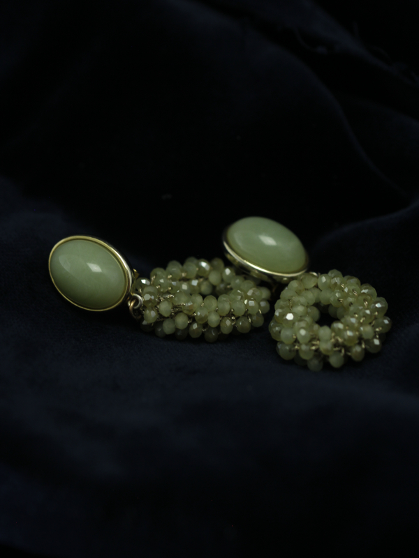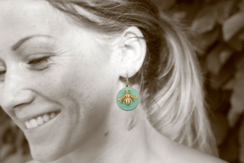 Einzigartige Ohrringe mit hellem grünem Medaillon, umrandet von goldenen Perlen, und einer kunstvollen goldenen Biene in der Mitte. Ein elegantes Accessoire, das Eleganz und Raffinesse verkörpert.