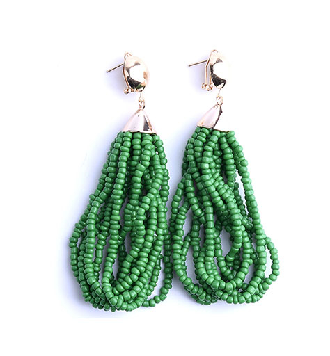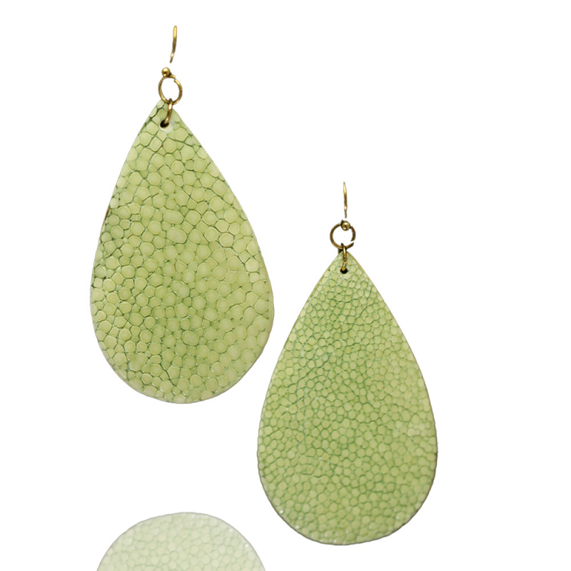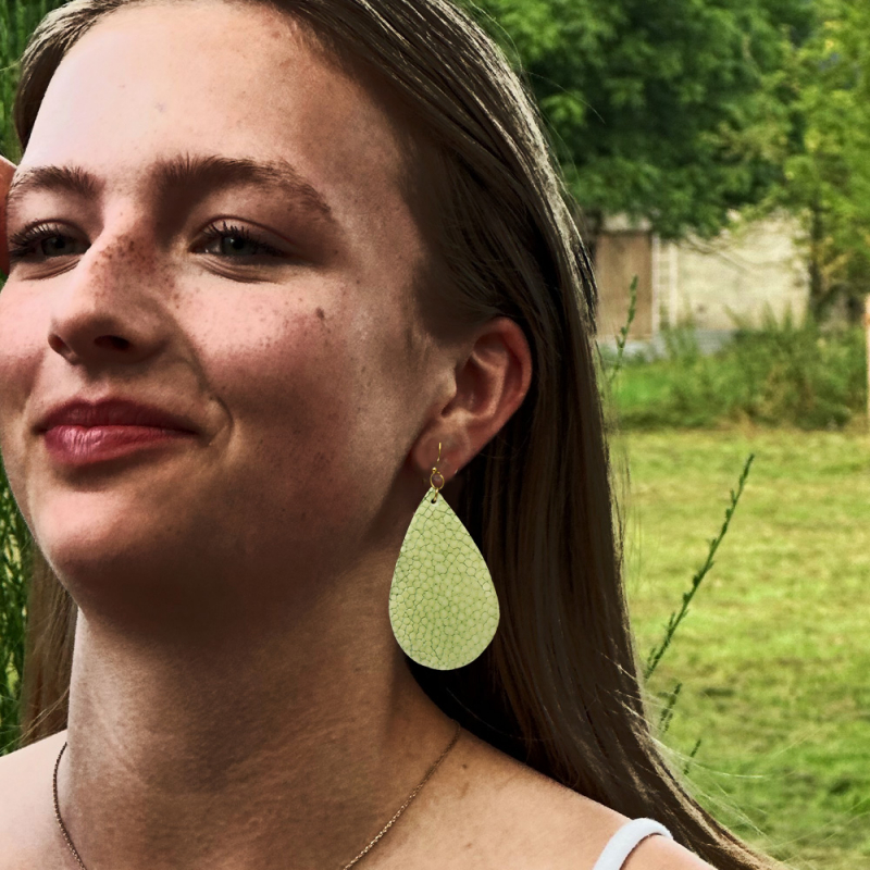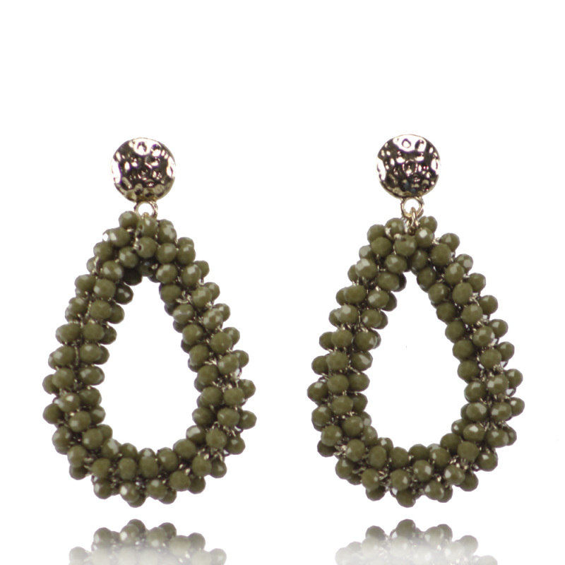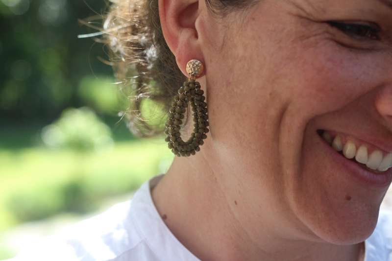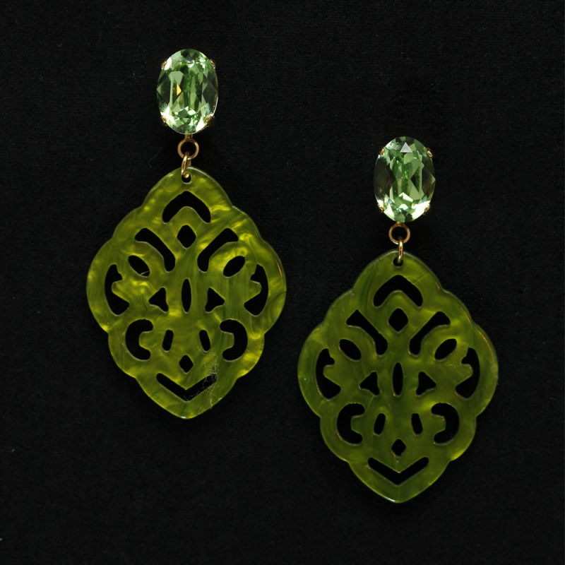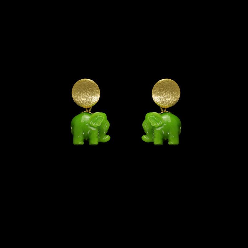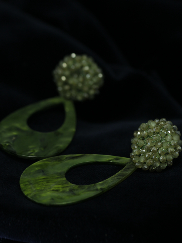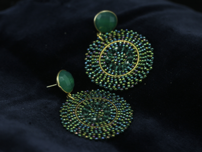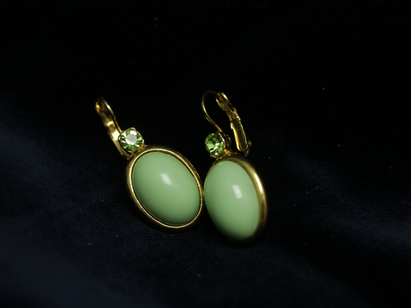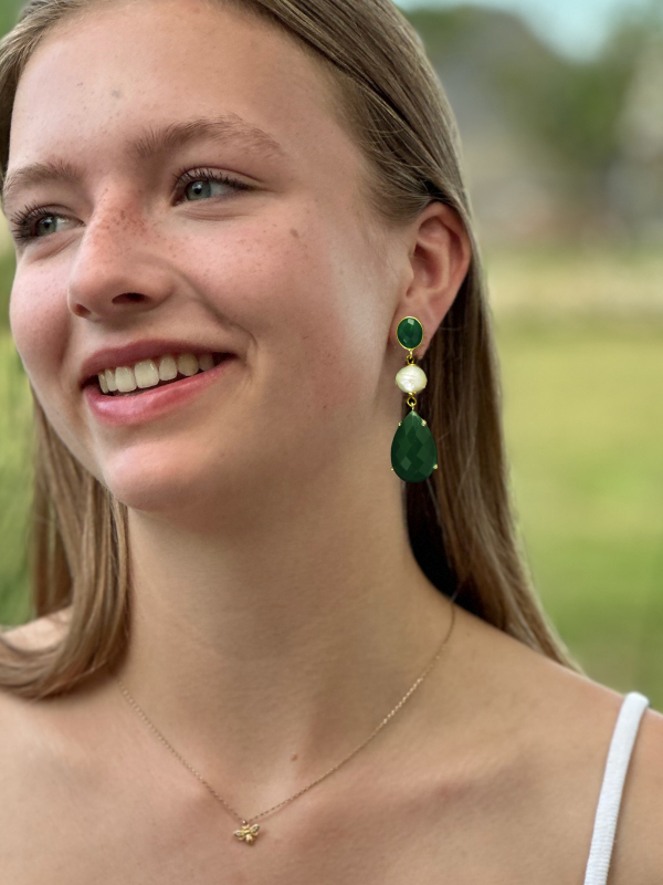 Einzigartige Ohrringe mit hellem grünem Medaillon, umrandet von goldenen Perlen, und einer kunstvollen goldenen Biene in der Mitte. Ein elegantes Accessoire, das Eleganz und Raffinesse verkörpert.