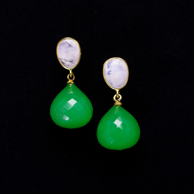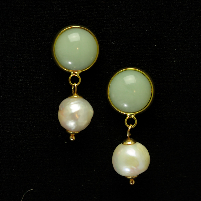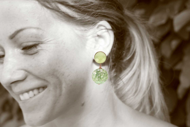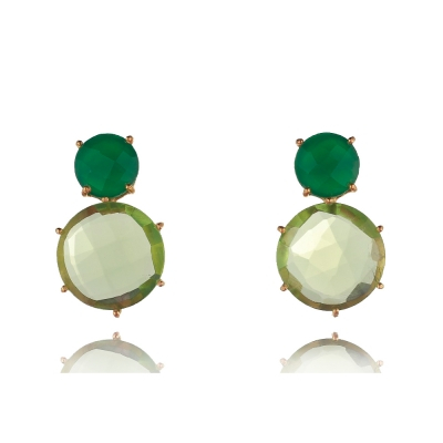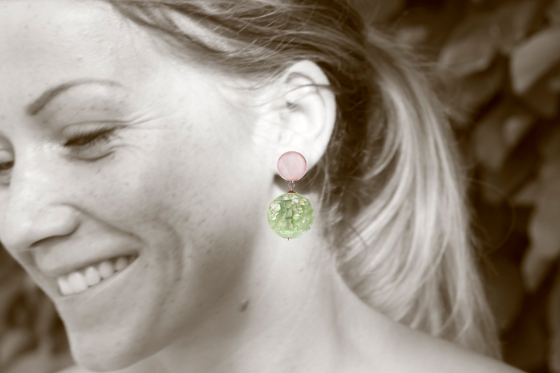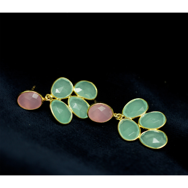Vergoldete 935-Silber-Creolen mit zarten rosa und hellgrünen Chalcedonen. Eine elegante Kombination aus Luxus und Natürlichkeit, die jedem Look subtile Raffinesse verleiht.